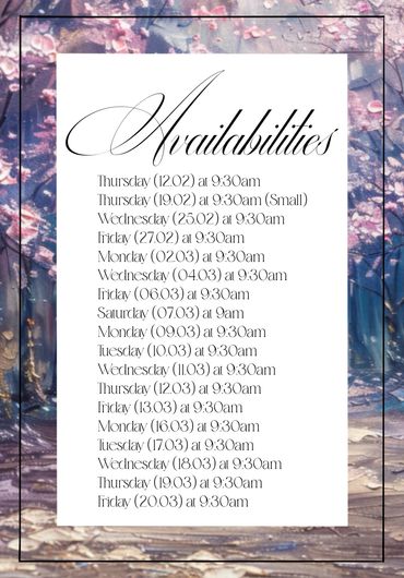 I generally offer Monday-Saturday availabilities, however, do be mindful that my weekends tend to book out quickly.